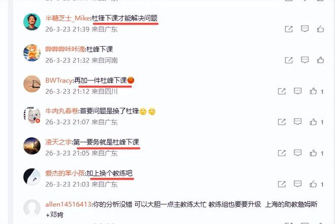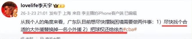 不过广东球迷对李天宇表示认可的同时,还补充了一条,他们调侃李天宇说,”博主还是没说真话“、“再加一件杜峰下课”,大家都说,只有杜锋下课才能解决问题,如果他还带队,再来高大的外援可能也没有用。他的用人让广东球迷伤心,好的不用,偏偏喜欢用那两个老寒腿(指18和25号)杜锋一天不离开广东队,球队的困境就不能摆脱。你们说呢?